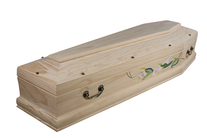 Cercueil en pin naturel, confectionné dans un bois brut offrant une esthétique douce et apaisante. Il est orné d’un motif floral peint à la main, représentant des fleurs de calla délicates, qui apportent une touche personnalisée et chaleureuse. Ce modèle se distingue par son authenticité et son caractère artisanal.