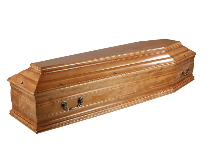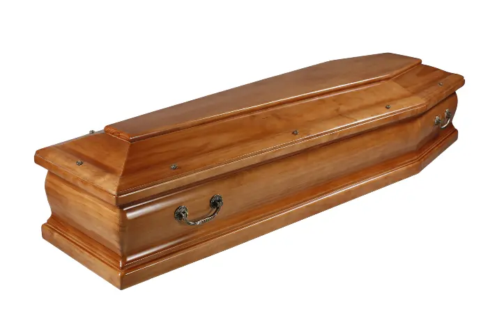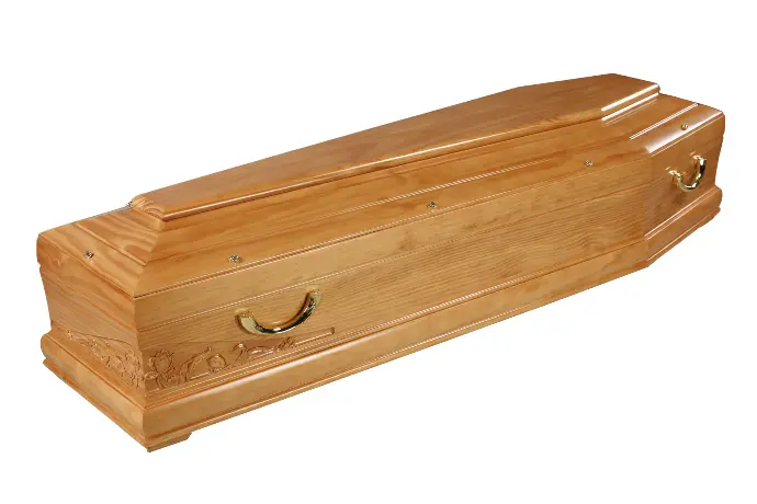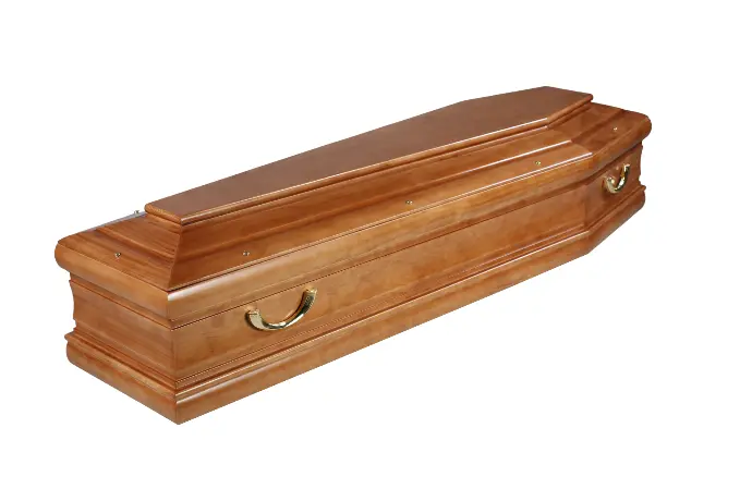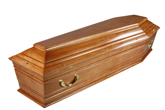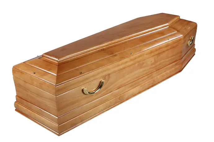Cercueil en pin massif au ton miel chaleureux, mis en valeur par un vernis brillant qui laisse apparaître un veinage naturel harmonieux. Son design traditionnel se distingue par des lignes douces et des moulures soignées, offrant une allure sobre et raffinée. Ce cercueil allie authenticité, luminosité et discrétion, constituant un choix respectueux et digne pour une cérémonie.
