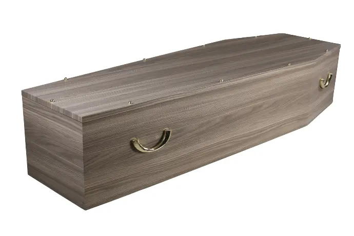 Cercueil en pin massif recouvert d’un placage bois au ton gris-brun, offrant une esthétique moderne et épurée. Le placage met en valeur un veinage fin et régulier, apportant une touche contemporaine tout en conservant la chaleur du bois naturel. Ses lignes droites et son design sobre lui confèrent une allure minimaliste et harmonieuse. Un modèle à la fois économique, écologique, discret et soigné, idéal pour ceux qui recherchent un style simple, moderne et respectueux.
