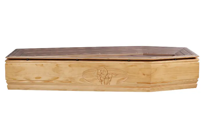 Cercueil en pin massif au ton clair et chaleureux. Son design épuré est rehaussé d’un couvercle contrasté en bois plus sombre, créant un effet esthétique moderne et harmonieux. La face avant est ornée d’une sculpture délicate représentant des fleurs de calla, symbole de pureté et de sérénité, apportant une touche artisanale et raffinée à l’ensemble. Idéal pour une cérémonie empreinte de dignité et de respect.