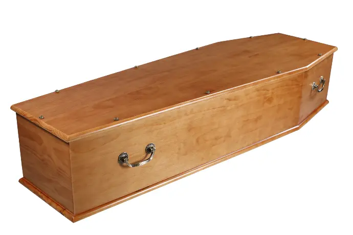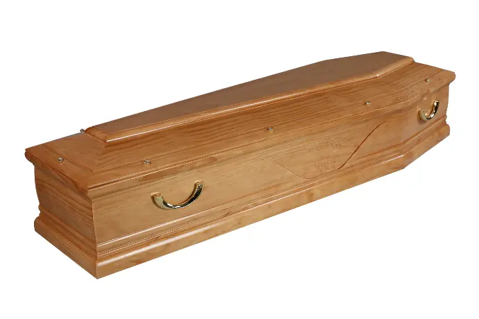 Cercueil en pin massif, réalisé dans un bois clair soigneusement sélectionné pour son veinage harmonieux et sa robustesse naturelle. Le modèle présente une finition lisse et brillante qui met en valeur la chaleur du bois et son caractère authentique. Ses lignes classiques, soulignées par un travail d’assemblage précis, lui confèrent une allure élégante et intemporelle.