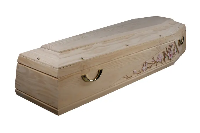Cercueil en pin massif au ton miel chaleureux, rehaussé d’un vernis brillant qui met en valeur le veinage naturel et lumineux du bois. La face latérale est délicatement ornée d’une sculpture florale représentant des branches de magnolia. Ses lignes classiques et ses moulures fines apportent une esthétique élégante et soignée. Un modèle harmonieux et raffiné, idéal pour une cérémonie empreinte de dignité, de délicatesse et de sérénité.
