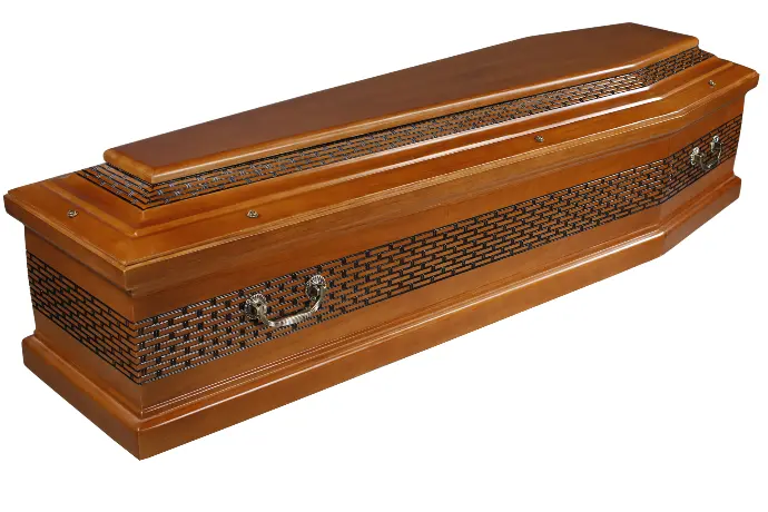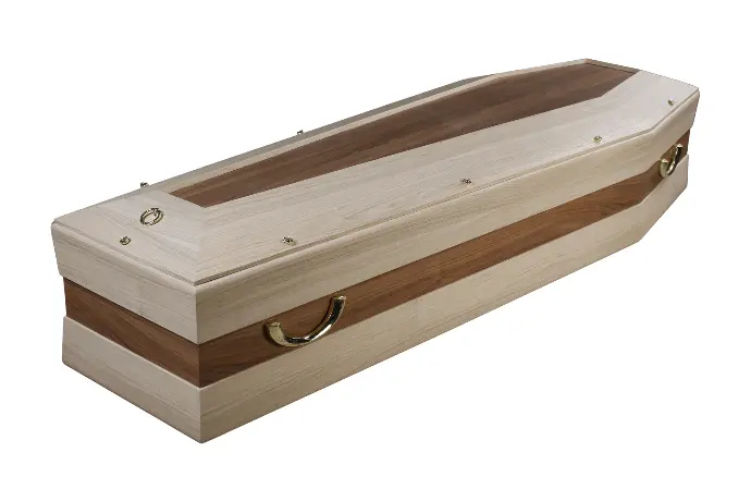 Cercueil en pin massif revêtu d’un placage bicolore moderne, alternant un ton clair naturel et un bois plus foncé au veinage chaleureux. Ce contraste harmonieux crée une esthétique contemporaine et raffinée, tout en mettant en valeur la structure du cercueil. Les lignes nettes et le design géométrique apportent une touche d’élégance originale.