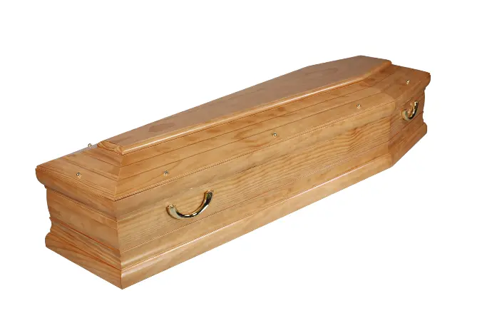 Cercueil en pin massif au ton chaud et miel, sublimé par un vernis brillant qui révèle la finesse du veinage naturel du bois. Son design traditionnel, aux lignes épurées et aux formes harmonieuses, lui confère une allure sobre et élégante. Ce modèle se distingue par sa simplicité noble et son esthétique lumineuse, offrant une présence apaisante et respectueuse pour la cérémonie.