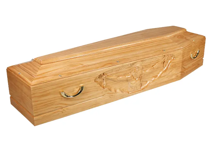 Cercueil en pin massif au ton miel chaleureux, sublimé par un vernis brillant qui met en valeur le veinage naturel du bois. La face latérale est ornée d’une sculpture religieuse finement réalisée, représentant le Christ. Ses lignes classiques, rehaussées de moulures soignées, offrent une esthétique noble et traditionnelle. Un modèle raffiné, empreint de respect et de solennité, idéal pour une cérémonie à forte portée symbolique.