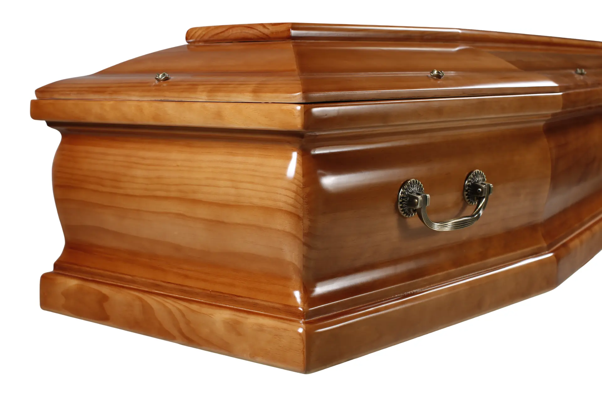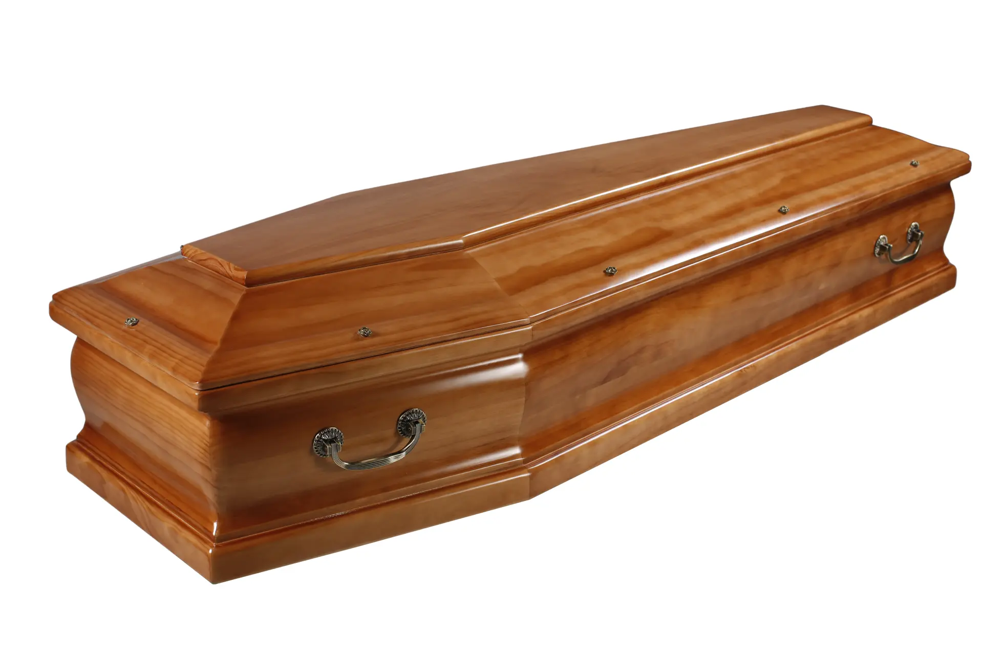- Cercueil en pin massif au ton miel profond, sublimé par un vernis très brillant qui souligne avec finesse le veinage chaleureux du bois.