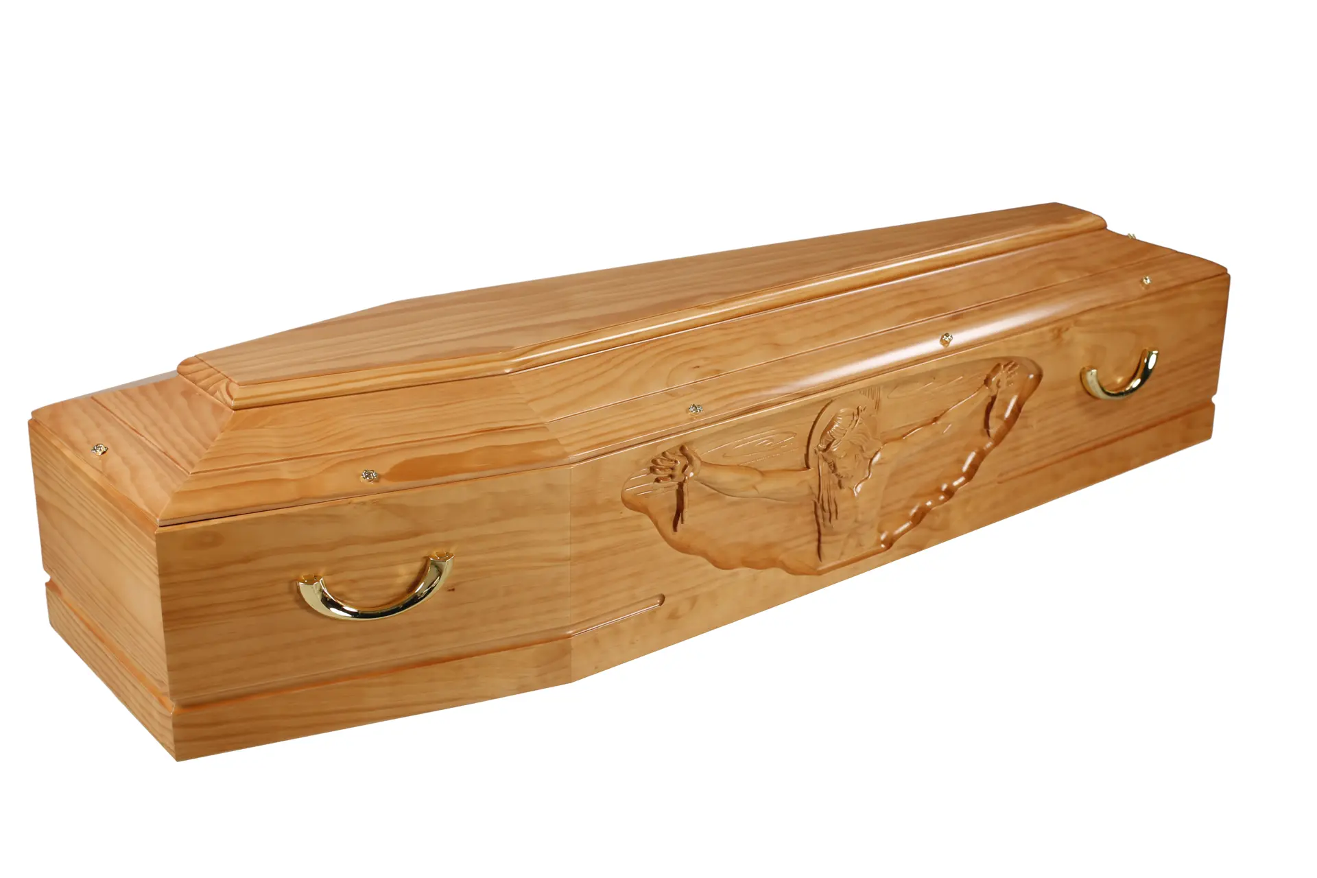 - Cercueil en pin massif au ton miel chaleureux, sublimé par un vernis brillant qui met en valeur le veinage naturel du bois.
