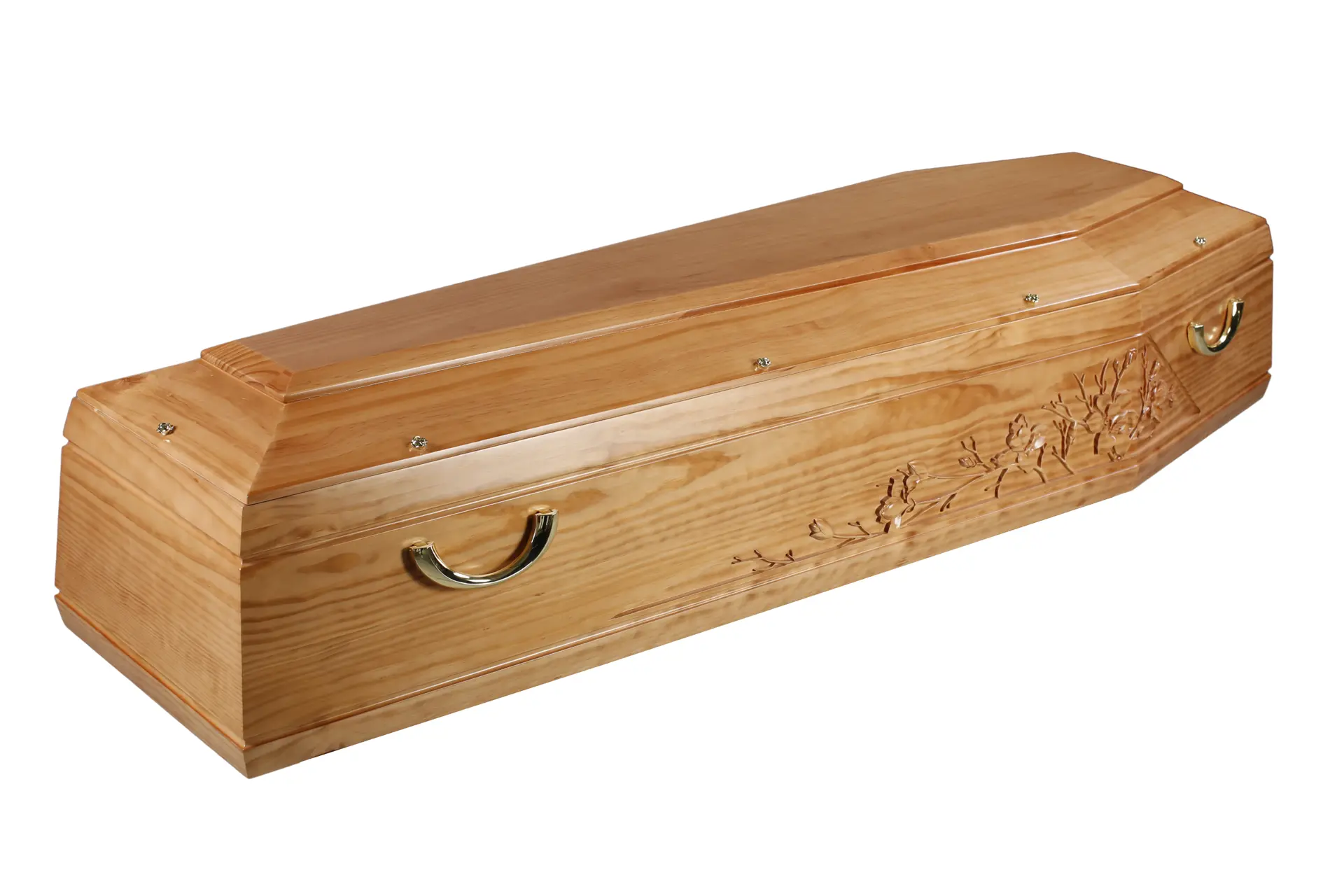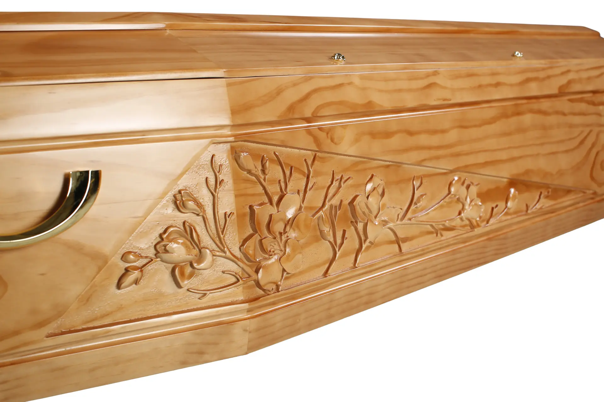 - Cercueil en pin massif au ton miel chaleureux, rehaussé d’un vernis brillant qui met en valeur le veinage naturel et lumineux du bois.