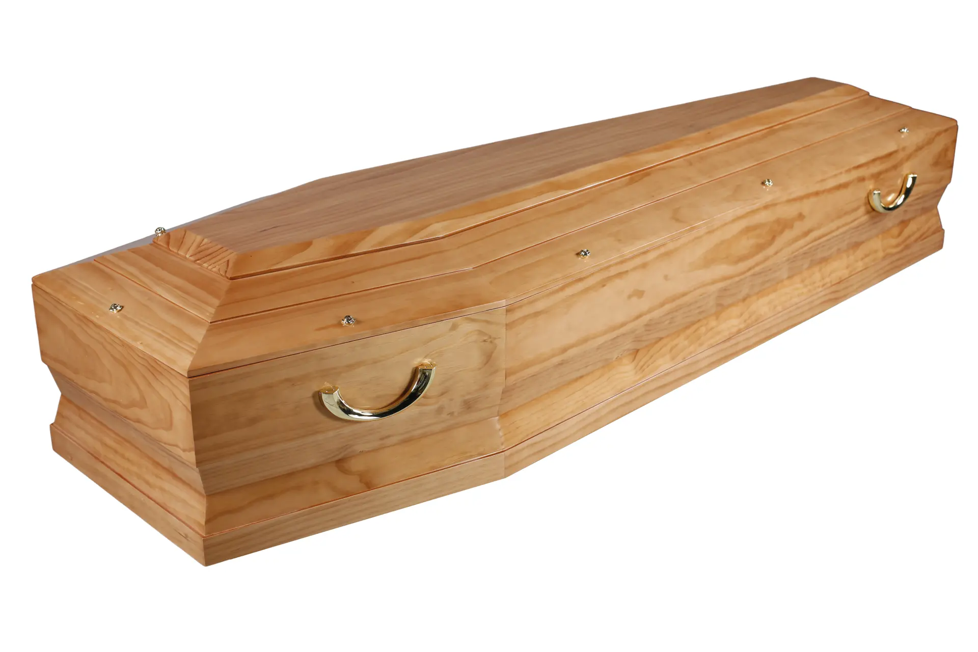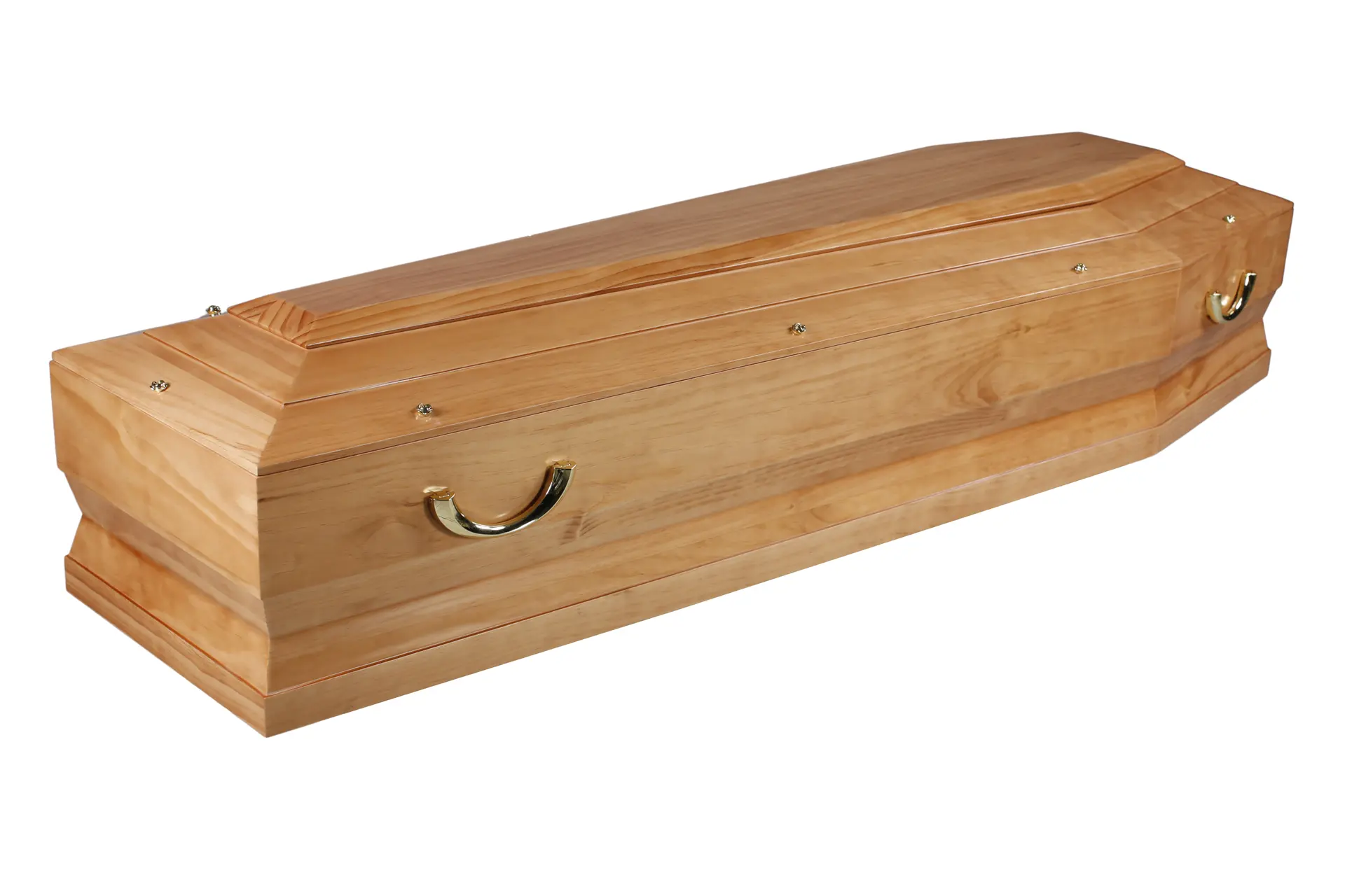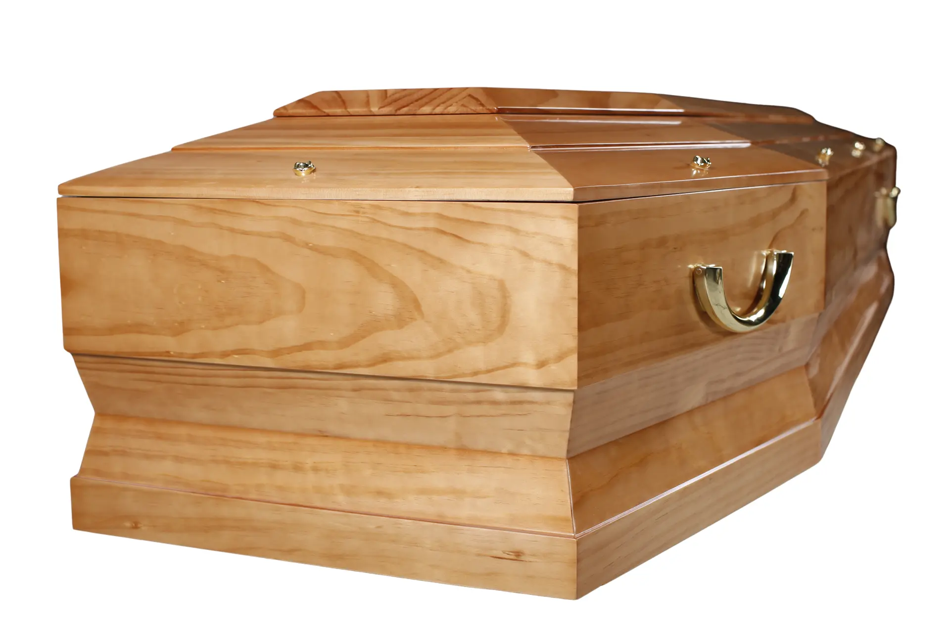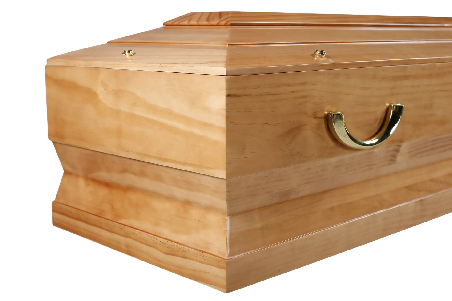 - Cercueil en pin massif au ton clair et chaleureux, mis en valeur par un vernis brillant qui révèle la beauté du veinage naturel du bois.