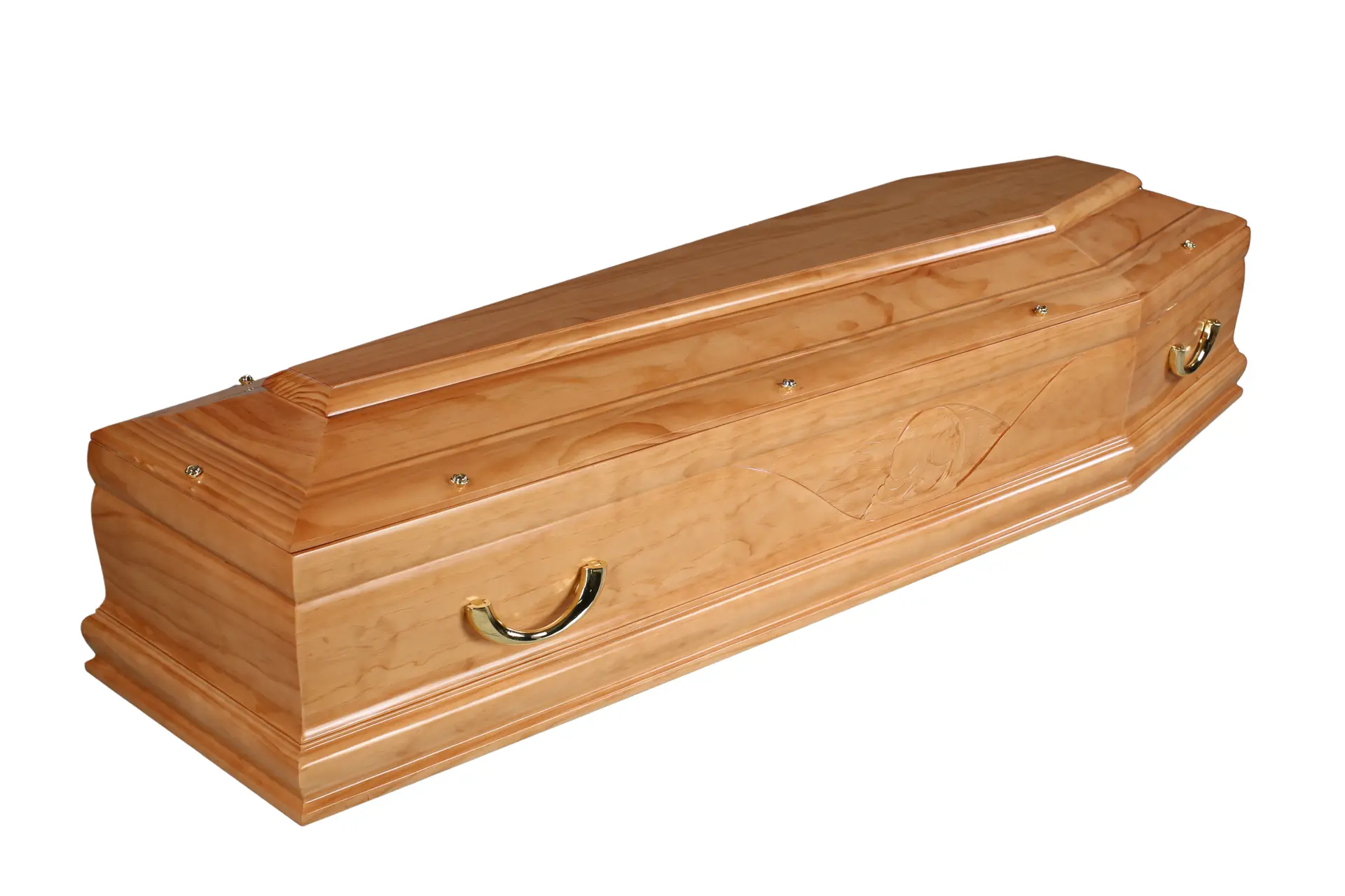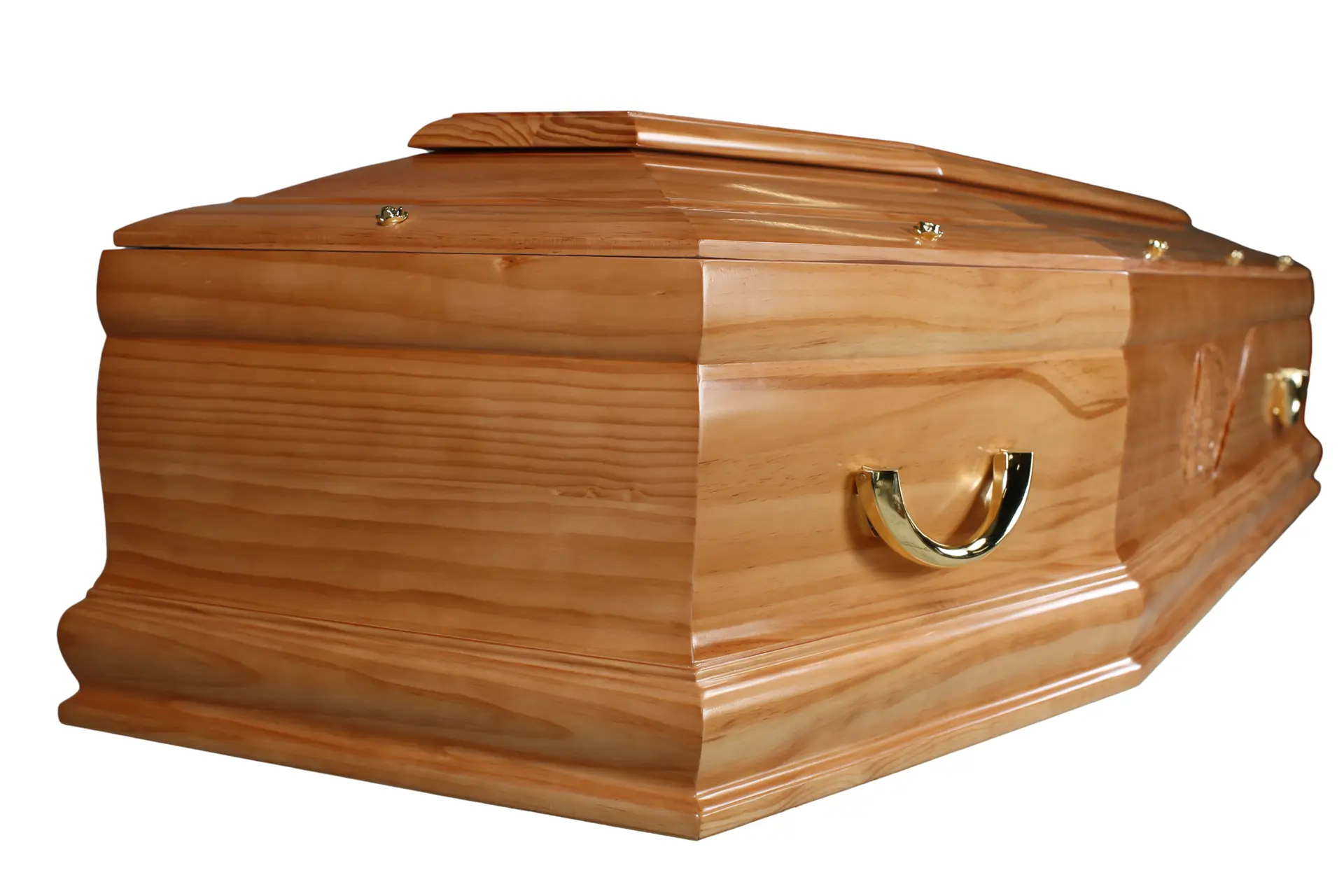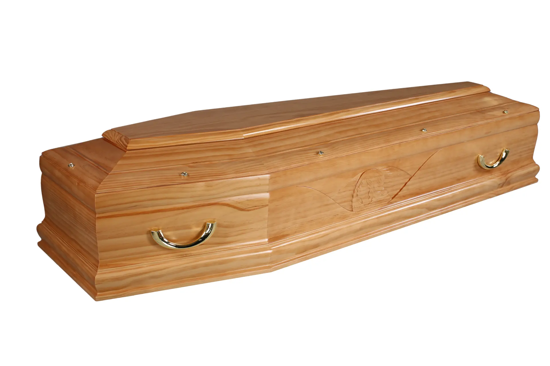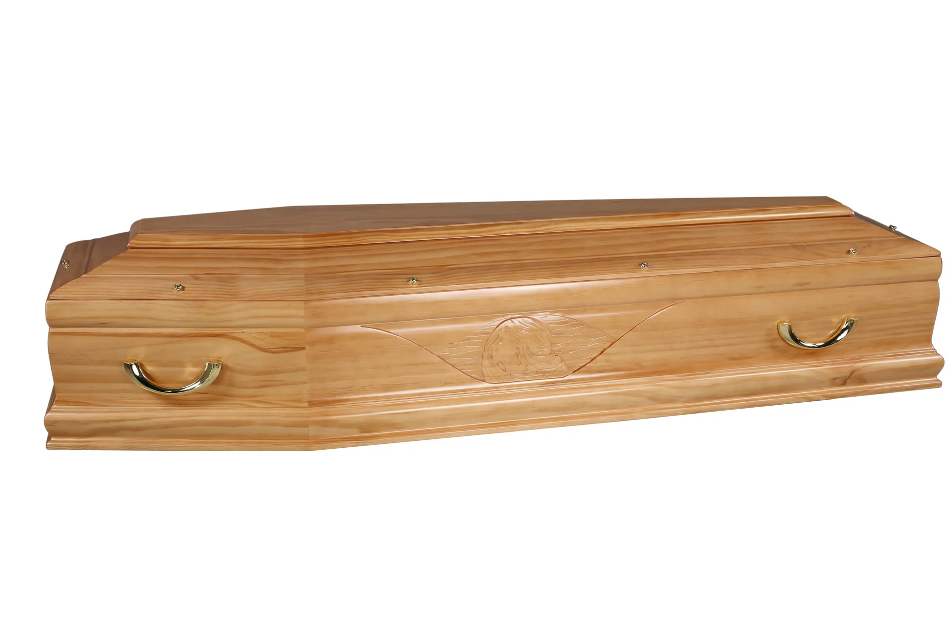 - Cercueil en pin massif au ton miel clair, sublimé par un vernis brillant qui révèle parfaitement le veinage naturel du bois.