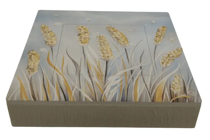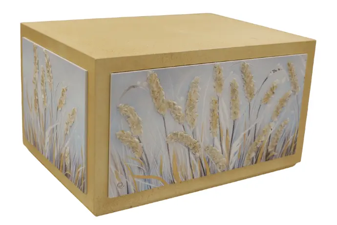 Urne cinéraire rectangulaire ornée de panneaux artistiques à relief représentant des épis de blé, symbole de paix, de cycle naturel et de continuité. Les couleurs douces et apaisantes apportent une atmosphère sereine et délicate. Son design naturel et discret en fait un modèle harmonieux pour un hommage empreint de douceur et de simplicité.