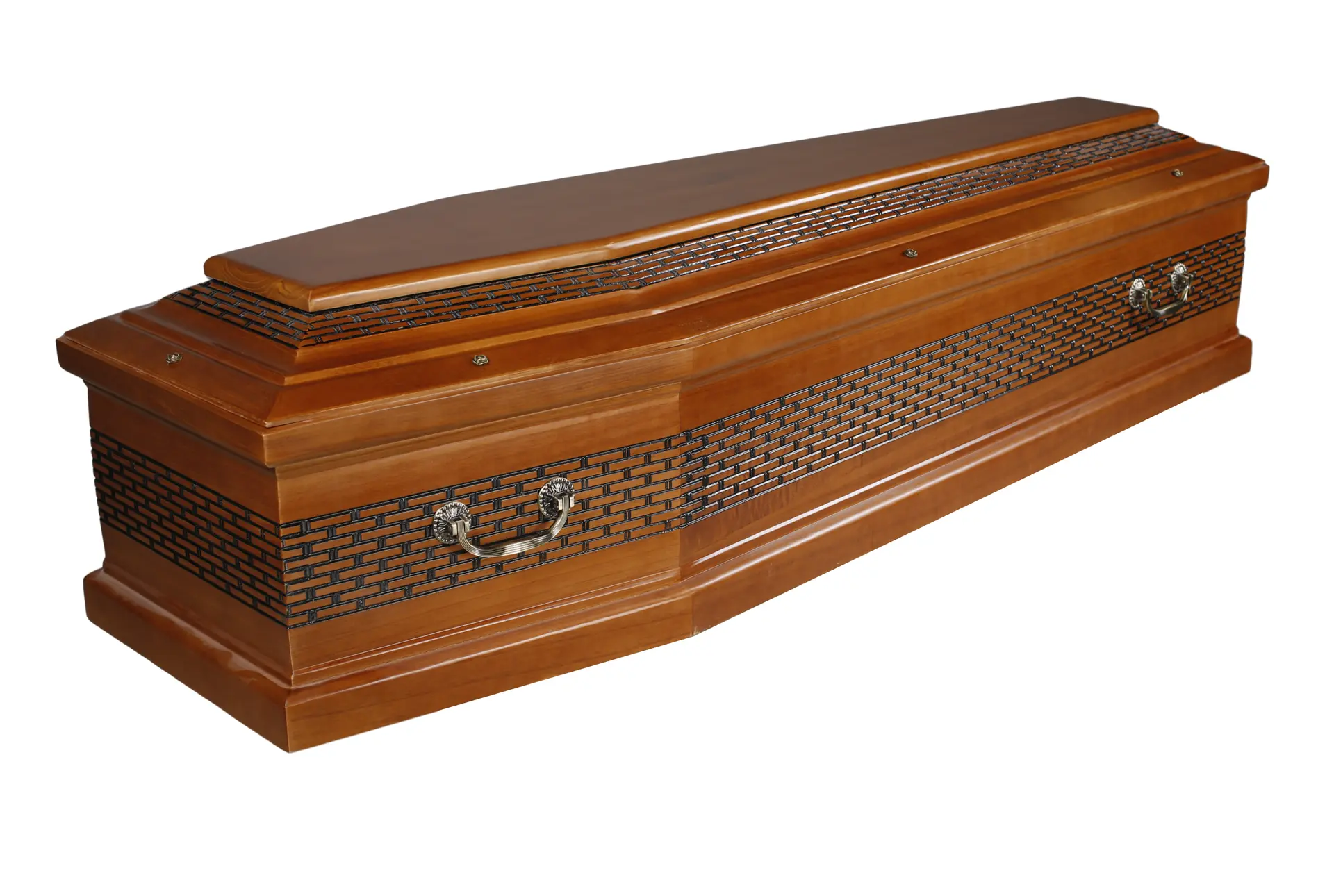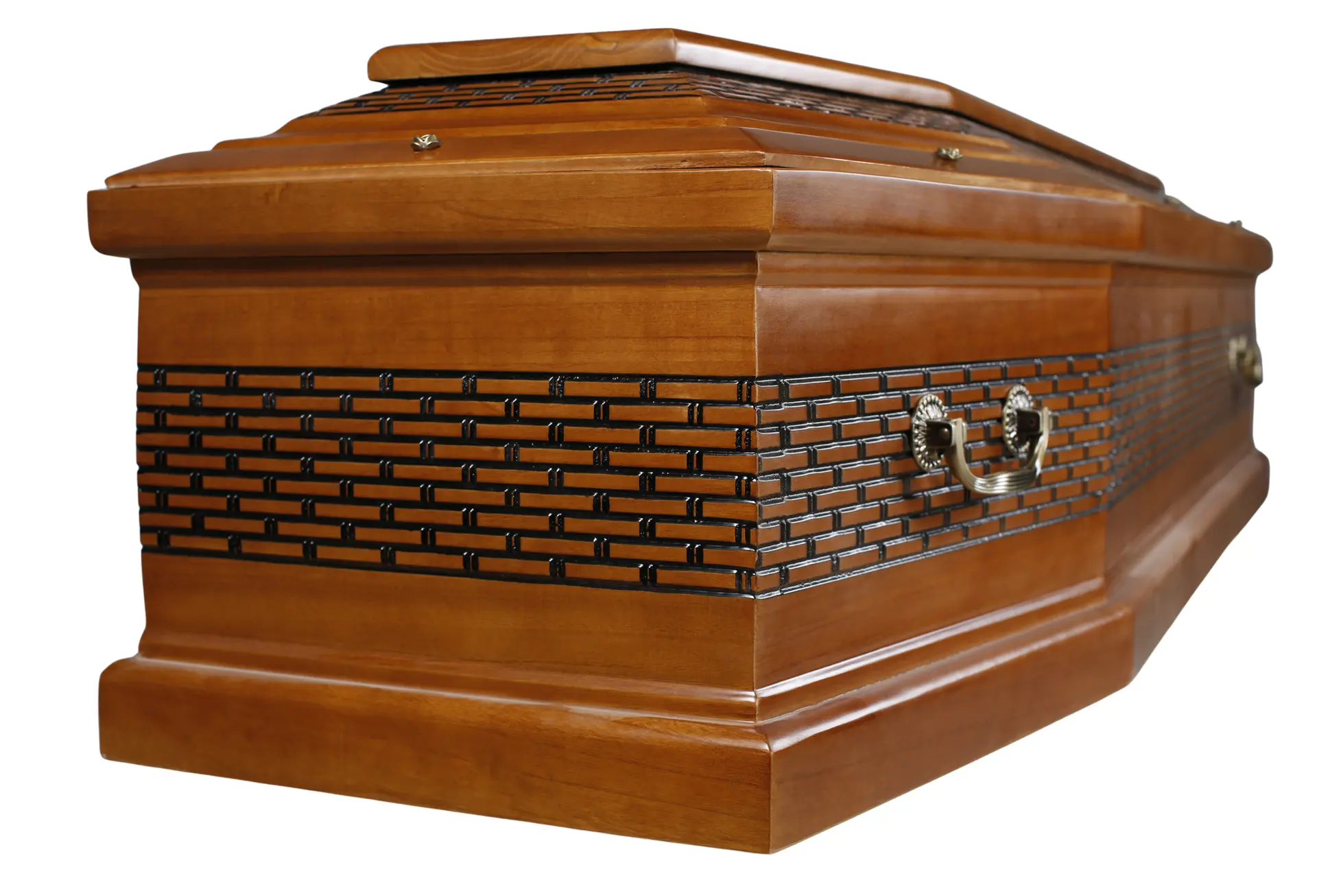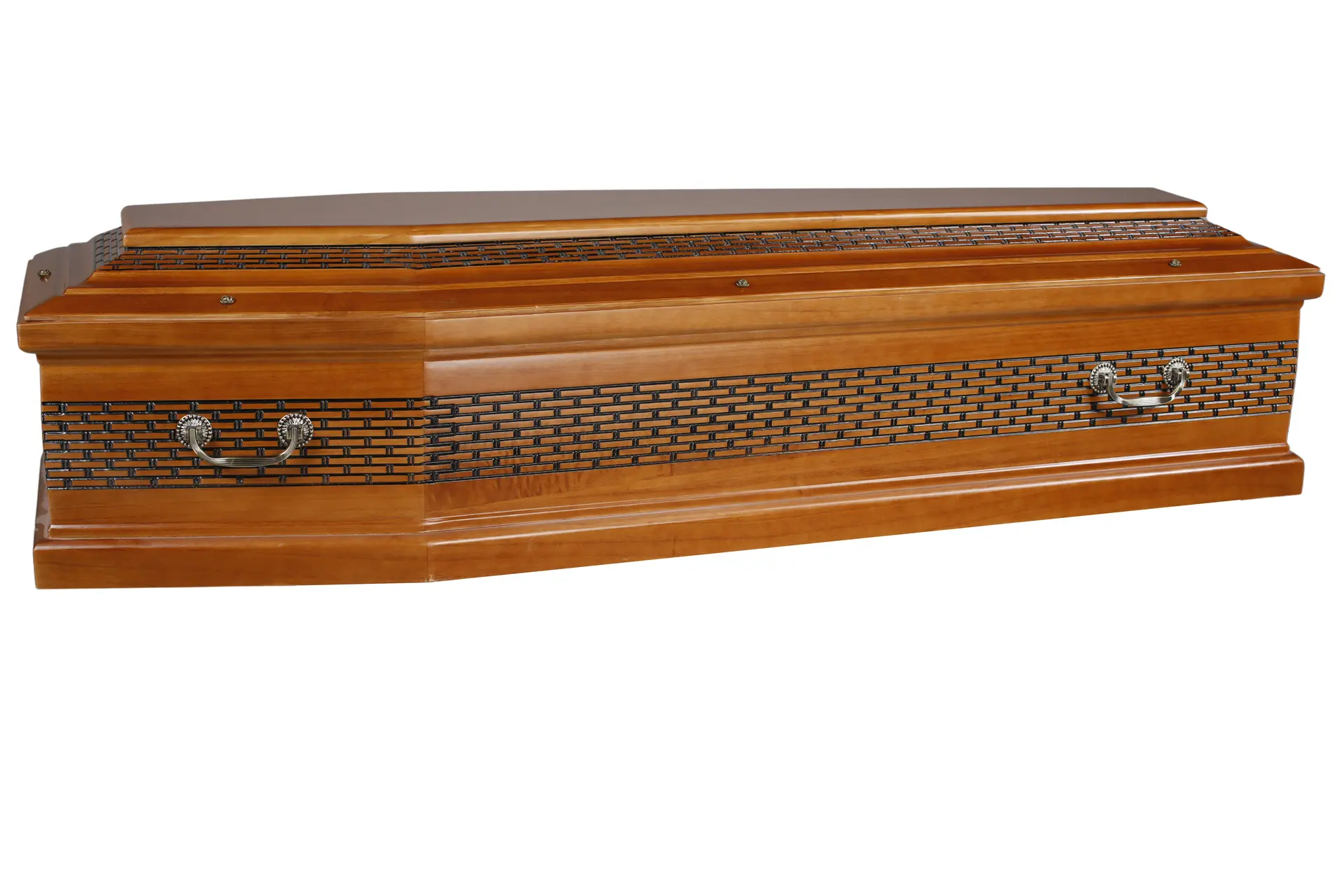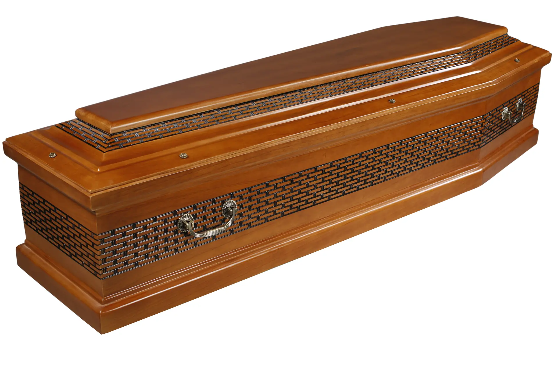 - Sa frise latérale sculptée et teintée en noir, composée d’un motif géométrique rappelant un tressage ou un décor de briques fines, apportant une touche de modernité et d’élégance. Avec ses lignes équilibrées et son style distinctif, ce cercueil offre un hommage digne et élégant, alliant tradition du bois massif et originalité décorative.
